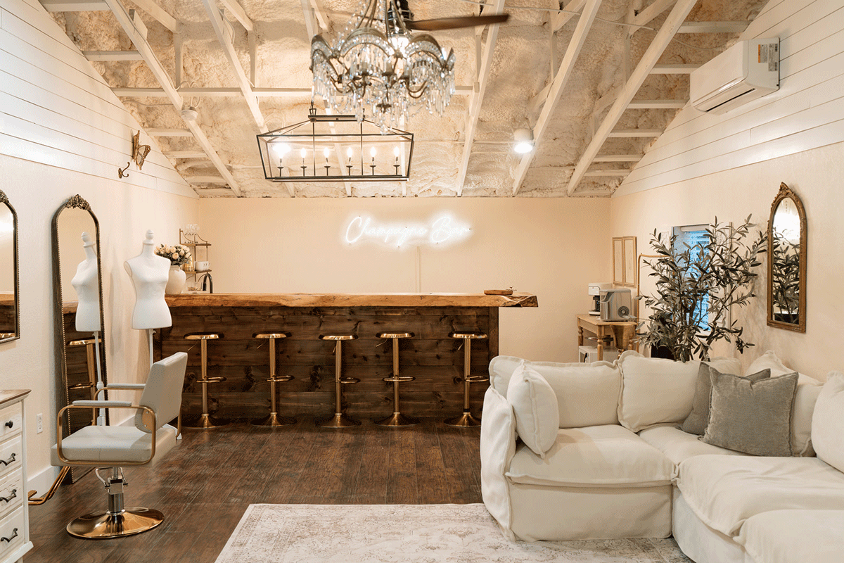 A dreamy bridal suite blending antique charm with modern design, featuring hair and makeup stations, a mimosa bar, kitchen appliances, a beautifully styled vanity & queen sized bed for iconic getting-ready photos.